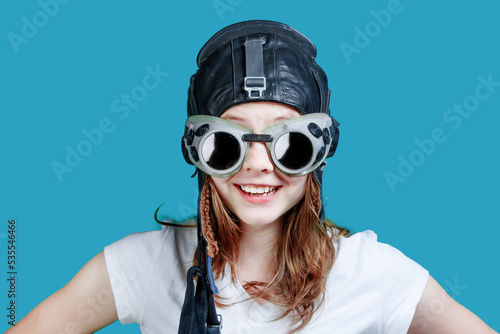 A symbol of travel and development - a teenager dreams of flying. A young girl-pilot against the sky. Girl in an aviator helmet, portrait on a blue background