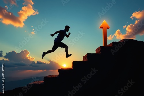 a symbolic concept image of human silhouette running up ascending steps leading to an arrow symbolizing victory perseverance dedication career growth and continuous progress in life challenges