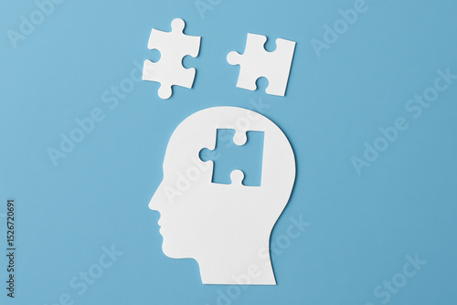 A symbolic concept insight and problem solving is shown by a human head silhouette with a puzzle piece missing representing mental clarity and strategic thinking in business