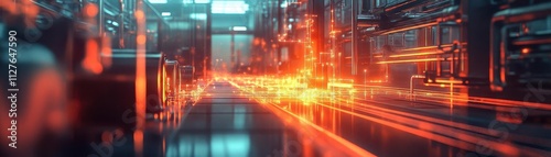A symbolic glowing design network connecting workers and wrapping stations, dramatic cinematic focus