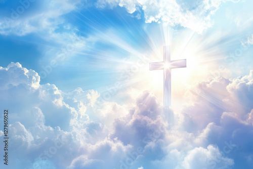 A symbolic illustration of a religious theme, with soft rays of light emanating from a delicate cross, surrounded by peaceful clouds and a calming aura.