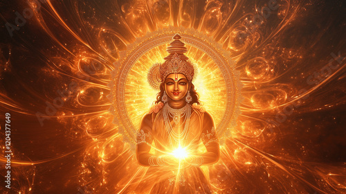 A symbolic representation of dharma as a glowing wheel behind Krishna, with spiritual energy radiating outward