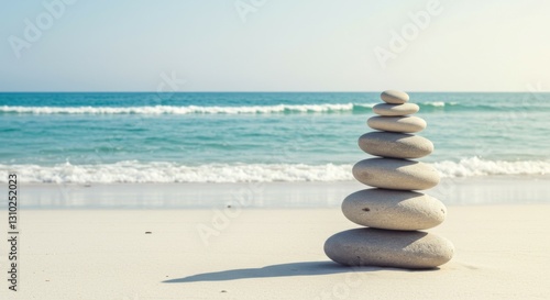 A symbolic representation of inner peace—zen stones stacked in perfect alignment by the sea.