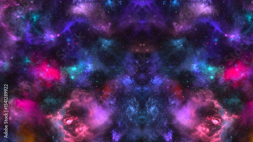 A symmetrical nebula with purple pink and blue colors forming a cosmic abstract background image art