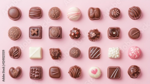 A Symphony of Hearts: A Delightful Collection of Exquisite Chocolate Hearts, Beautifully Displayed on a Pastel Pink Surface, Creating a Scene of Pure Romance and Sweet Indulgence
