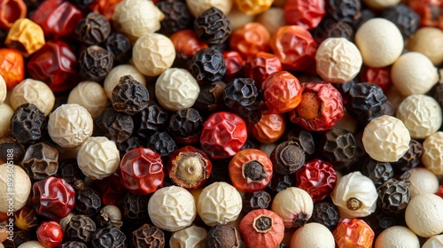 A Symphony of Peppercorns: A Colorful Array of Black, White, Red, and Green Peppercorns. Generative AI