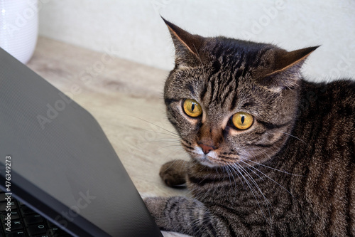 A tabby adult cat lies behind a laptop on the table. Selective focus. Image for articles about animals.