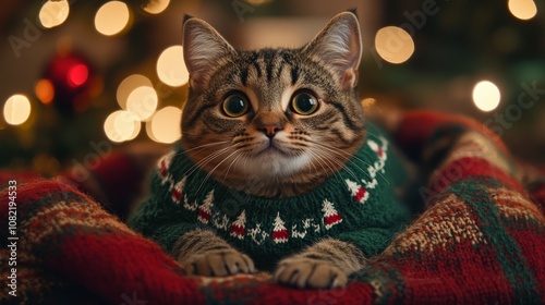 A tabby cat in a green ugly sweater with Christmas tree patterns lies on a plaid blanket. Christmas Jumper Day
