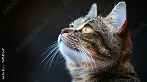 A tabby cat with a striking appearance gazes intently against a solid black background, showcasing its golden eye and crisp white whiskers