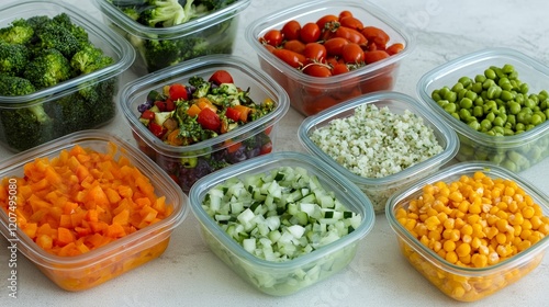 A table filled with freezer friendly prep ingredients like fresh vegetables grains and sauces ready to be portioned and sealed