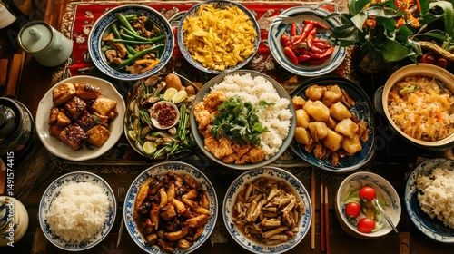 A table filled with various Asian dishes, including rice, noodles, vegetables, and meats, arranged in a colorful and vibrant display.