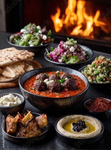 A table laden with diverse Mediterranean dishes, presented in a warm, inviting atmosphere