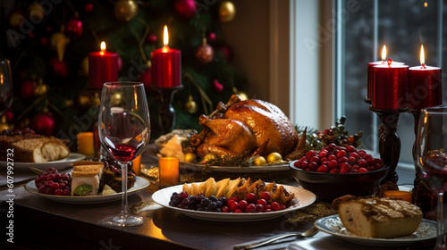 a Table set for a holiday feast with a golden turkey