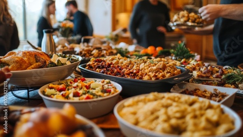 A Table Spread with Roasted Chicken, Stuffing, and Salads