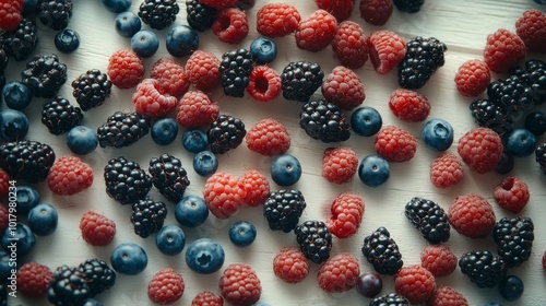 A table topped with white wood is filled with red raspberries, blue blueberries, and dark blackberries.