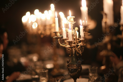 A table with a large number of candles on it. The candles are lit and the table is set for a formal dinner