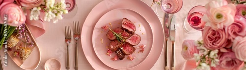 A table with a variety of meat and vegetables, including broccoli, tomatoes, and roses. The table is set for a romantic dinner