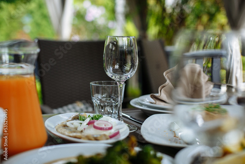 A table with beautiful dishes and prepared dishes on the summer terrace