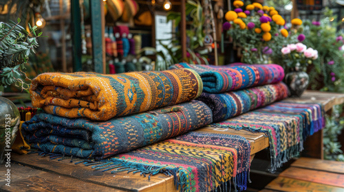 A table with colorful blankets and a vase of flowers. The blankets are arranged in a stack, with one of them being a bright yellow one. The table is surrounded by potted plants