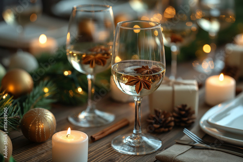 A table with two wine glasses, a plate, a fork, and candles