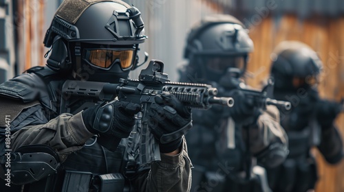 A tactical unit is shown aiming their weapons in a precise, coordinated formation, suggesting a high level of training and synchronization during a mission.
