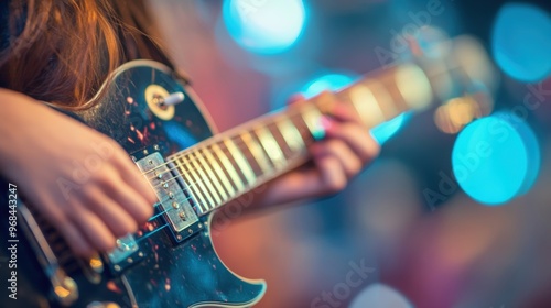 A talented female guitarist plays passionately during a band rehearsal, illuminated by vibrant stage lights