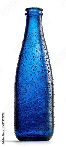 A tall blue glass bottle is covered with water droplets against a stark white background