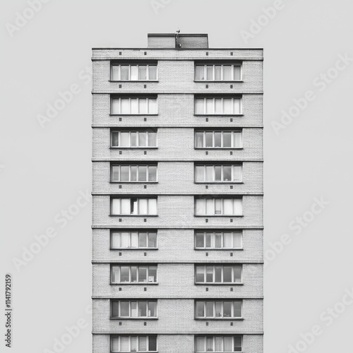 A tall building, gray in tone, with a gray stone texture, a symmetrical composition