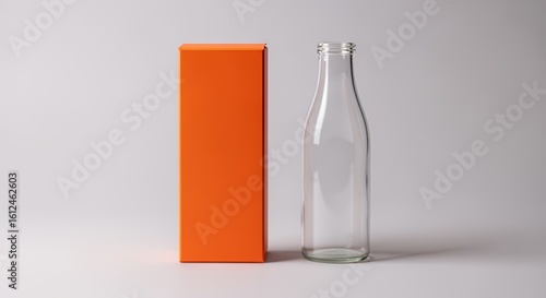A tall, clear glass bottle stands beside a vibrant orange rectangular box on a minimalist white background, creating a clean and modern product display.