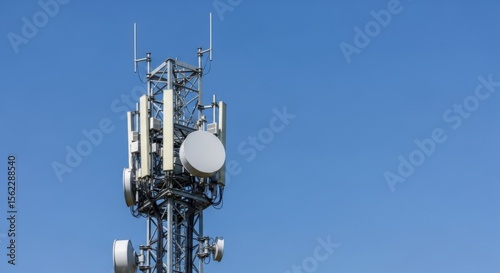 A Tall Communication Tower with Many Antennas Against a Clear Blue Sky