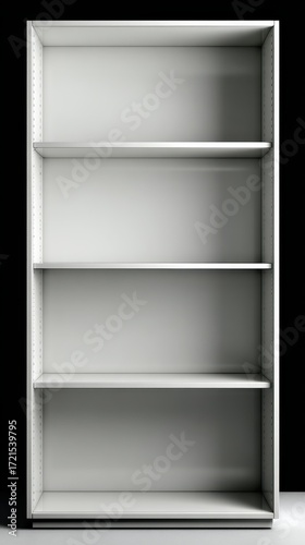 A tall, empty, white bookshelf stands against a plain black background. The shelves are evenly spaced.