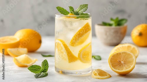 A tall glass of ice-cold lemonade, with condensation forming on the outside, garnished with fresh lemon slices and mint leaves