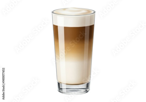 A tall glass of layered coffee drink with milk and foam on top isolated on a white background view