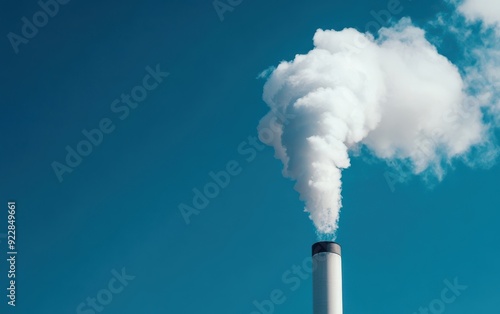 A tall industrial smokestack emitting white smoke against a clear blue sky, symbolizing pollution and environmental issues.