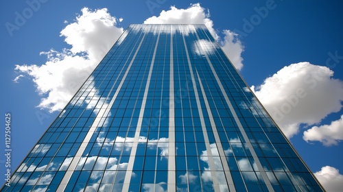 A tall modern skyscraper with reflective glass panels, showcasing clouds and blue sky in its surface