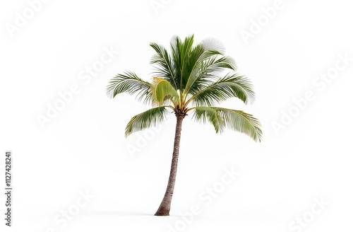 A tall palm tree stands prominently under a bright blue sky, surrounded by a serene atmosphere. Its green fronds sway slightly, creating a peaceful tropical feeling.