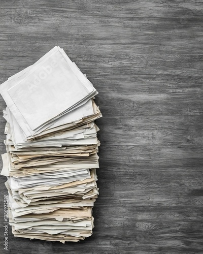 A tall stack of documents and papers on a rustic wooden table background.