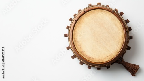 A tambura with a wooden body and strings, leaving space for text on the right side, against a pure white background