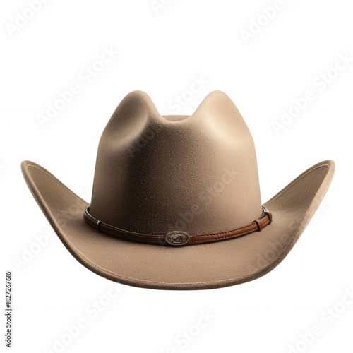A tan cowboy hat with a leather band and a silver buckle, transparent background