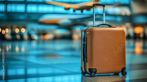 A Tan Suitcase Stands In An Airport Terminal
