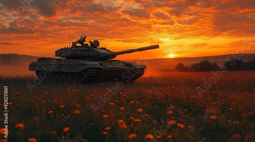 A tank in a peaceful meadow at sunrise, with wildflowers in the foreground and a contrast between the machine and the serene landscape.