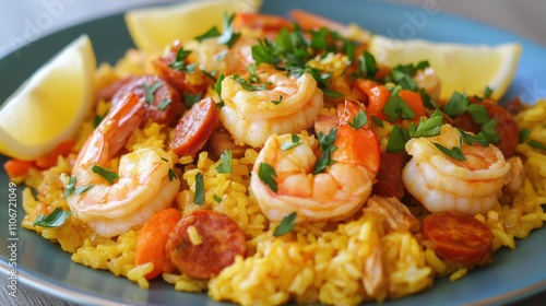 A tantalizing plate of traditional Spanish paella with saffron-infused rice, shrimp, chicken