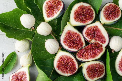 A tasty fig packed with organic vitamins and superfood benefits. Fresh figs sliced on leaves with whole figs in the background.