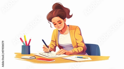 A teacher grading papers at a desk, educational task, realistic illustration, isolated on white background