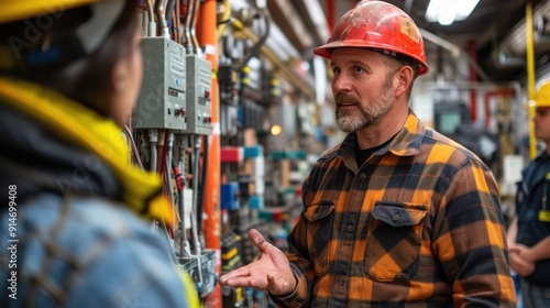 A teacher instructs apprentice electricians on electrical safety procedures in an industrial factory's well-equipped classroom using safety-assured wiring diagrams.