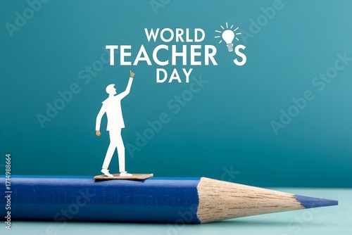 A teacher silhouette on a giant blue pencil reaches for an idea lightbulb. Generative Ai.