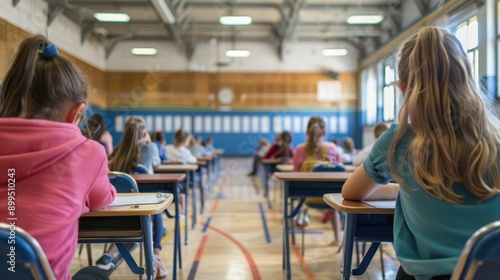 A teacher supervises middle school students taking exams at their desks in a school exam room.