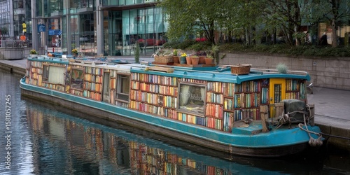 A teal book-covered houseboat floats serenely on a canal, a unique and charming sight.