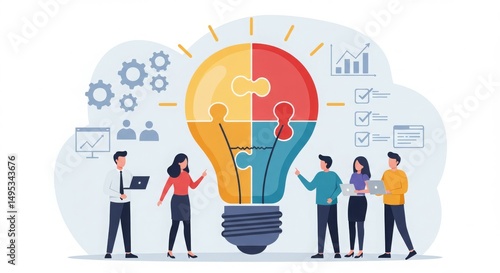 A team collaborates around a light bulb symbolizing ideas and innovation.