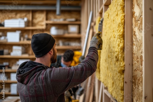 A team installing insulation inside a modular home wall section. The factory is equipped with shelves